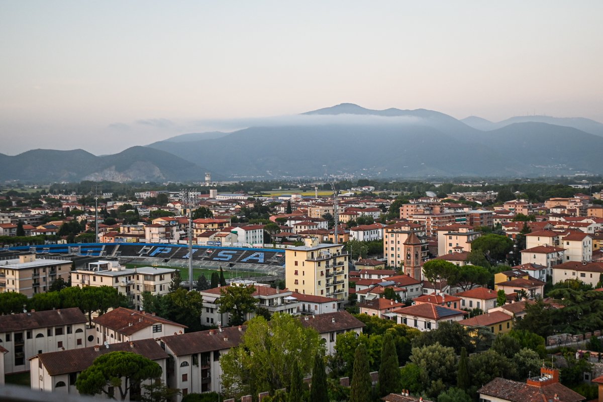 Oben auf dem Turm erwartete uns einer der intensivsten Momente unserer Reise. Der Sonnenuntergang zeigte Pisa von seiner allerschönsten Seite. Die Silhouette der Stadt, die ruhigen Straßen und die Hügel im Hintergrund verschmolzen mit dem warmen Licht zu einer fast surrealen Szenerie. Es war bewegend, dort zu stehen – nur wenige andere waren noch dort und jeder genoss ehrfürchtig das Schauspiel. Wir schauten lange, machten Fotos, doch eigentlich war es diese stille Minute der Bewunderung, die alles perfekt machte. Die Sonne versank langsam hinter den Bergen, das Licht spielte auf den Marmorfassaden, und für den Augenblick vergisst man die Zeit.